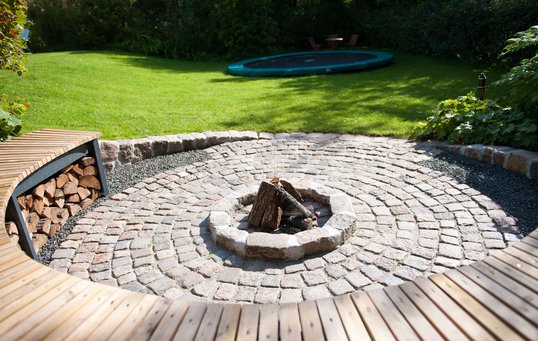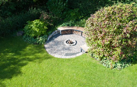 - Jeg kan godt lide runde, organiske former, og for at få bålpladsen helt integreret i haven, sænkede jeg den, så den ikke kom til at se for markant ud. Jeg gravede jord væk, så der var plads til granitskærver og chaussésten i plan med græsplænen, fortæller han.