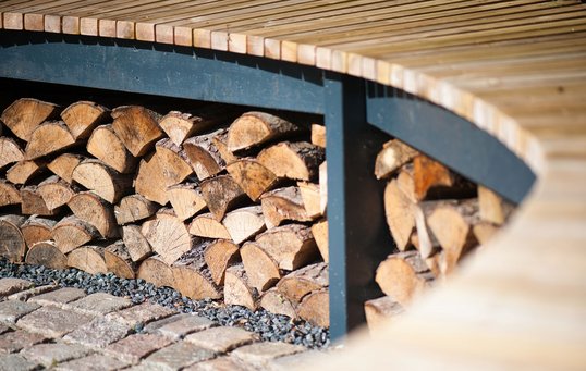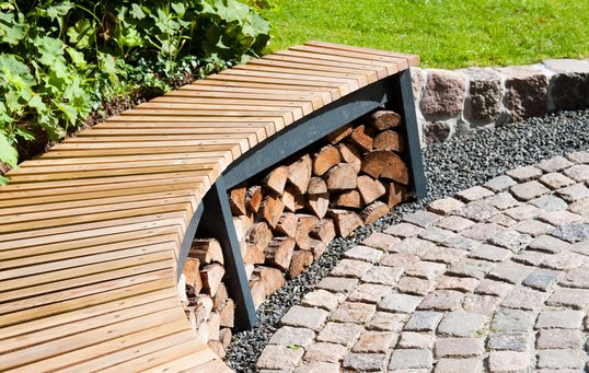 - Bænken er ca. 6 meter lang, og der er plads til en halv rummeter brænde under den.