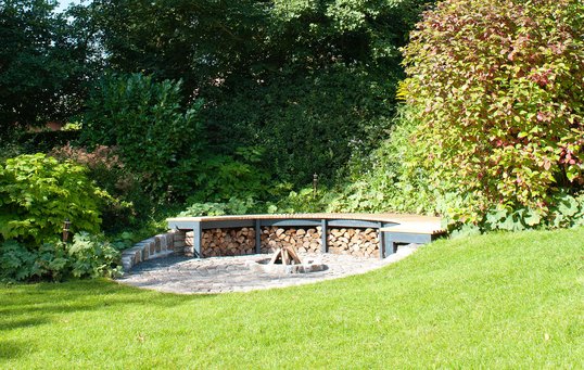 Når man sidder i bålhjørnet, er man i læ og helt isoleret fra omgivelserne. Bænken kan hverken ses oppe fra huset eller fra haven foran.