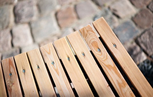 - Selve siddefladen/lamellerne er lavet af terrassebrædder af trykimprægneret fyrretræ, 120 x 28 mm, som er delt i tre og derefter skåret op i 60 cm stykker. Pris max. 1.000 kr. i alt.