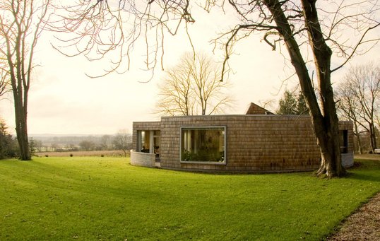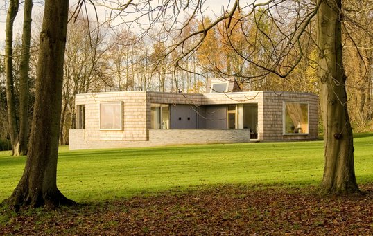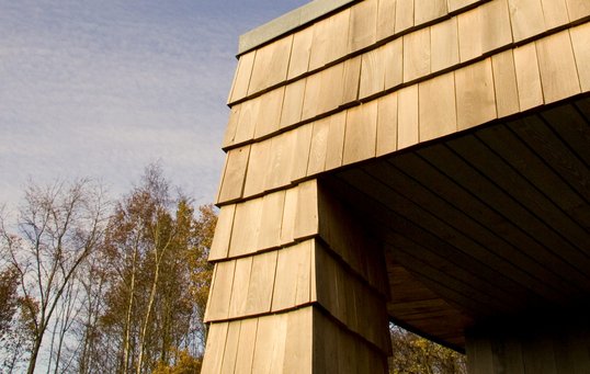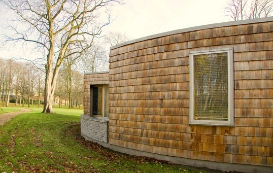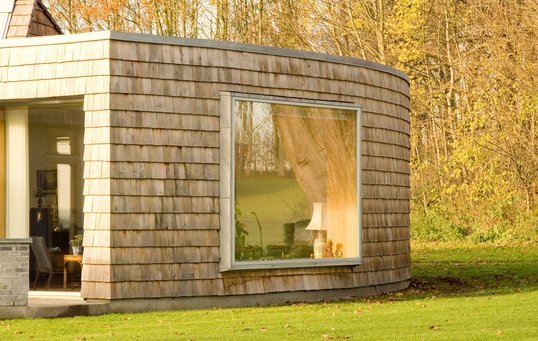 Udendørs oplever man derimod, at huset er rundt, Det betyder, at huset ikke har en forside og en bagside, men ligeværdige facader 360 grader. Den runde form understreger, at der indefra er et kontinuerligt kig ud til alle verdenshjørner.