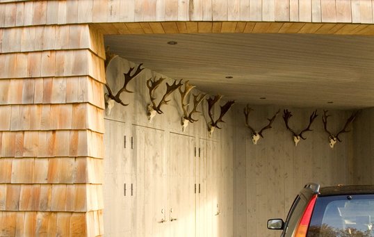 I garagens væg er der indbygget skabe til opbevaring som erstatning for en kælder.