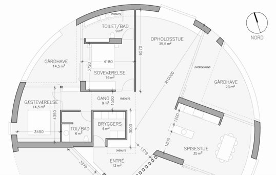 Martin Wienberg havde ikke tegnet runde huse før, men han var sikker på, at huset ikke ville opleves som cirkulært, når man færdes i det. Det skyldes rummenes indbyrdes placering og de glidende overgange mellem dem. Fordelen ved et cirkulært hus er, at det opleves kompakt, uden spildplads og med kort gåafstand mellem rummene.