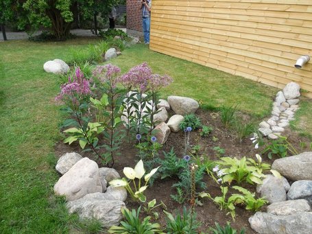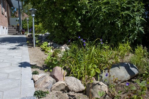 Mange vælger at plante regnbedet til med blomstrende planter. Sørg for at vælge robuste planter, der både tåler tørre og våde perioder. Foto: Ann Lilja, Haveselskabet