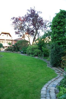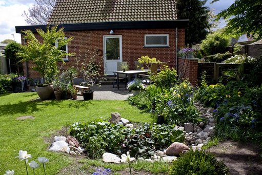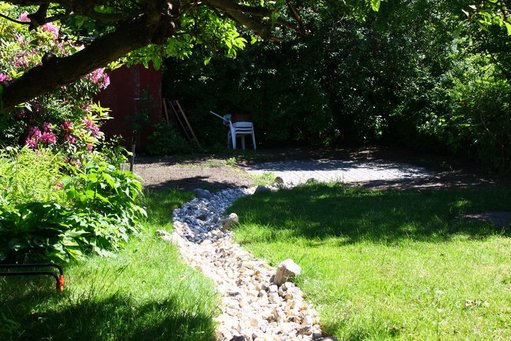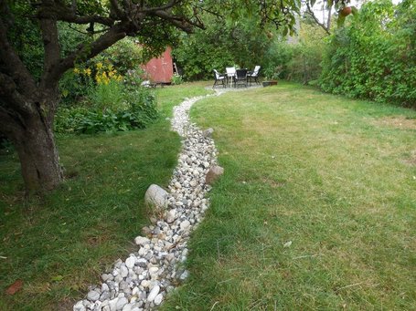 Et regnbed skal placeres i et lavtliggende område af haven, så vandet kan løbe derhen. Sørg også for, at terrænet falder væk fra bygninger. Regnbedet må til gengæld ikke hælde - det skal være i niveau med terrænet. Foto: Ann Lilja, Haveselskabet