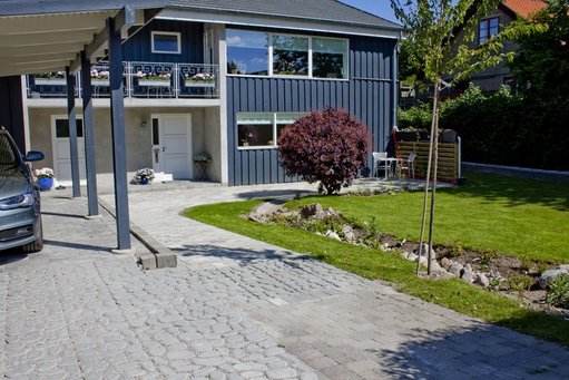 Du kan købe forskellige render og særlige belægningssten, der er specielt udformet til formålet. Sørg for, at renden har et fald på minimum 1 cm pr. meter.