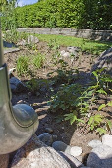 Find ud af, hvordan du vil lede regnvandet fra tagnedløbet til regnbedet. Det nemmeste er at grave en rende, som nedløbsrøret lader vandet løbe ned i. Foto: Ann Lilja, Haveselskabet