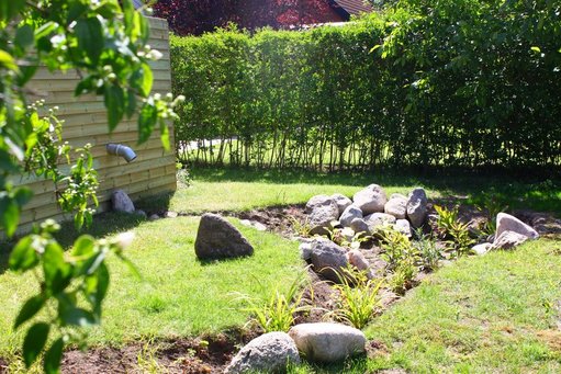Sørg også for, at terrænet falder væk fra bygninger. Regnbedet må til gengæld ikke hælde - det skal være i niveau med terrænet, men kan sagtens være gravet ud i dybden.