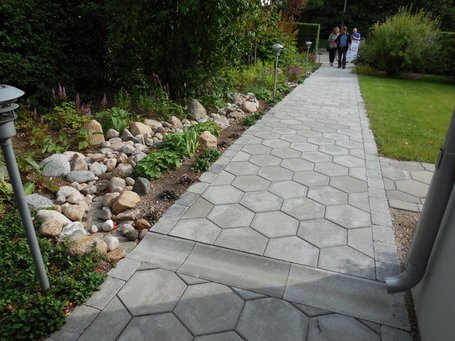 Den typiske løsning er at forlænge nedløbsrøret, men du kan også lave renden af fx chaussésten, som du murer sammen, så den er tæt. Foto: Ann Lilja, Haveselskabet