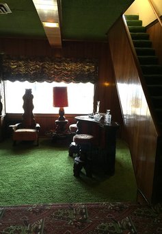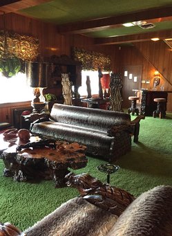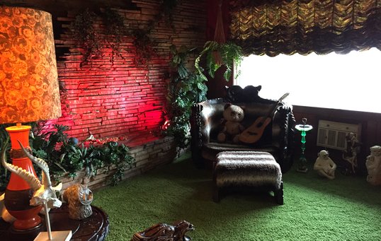 Gracelands berømte junglerum har et polynesisk tema og er dekoreret med tykke grønne tæpper, tekstiler med dyretryk og eksotiske planter. Møblerne købte Elvis i 1974 angiveligt for at drille sin far, der skulle have sagt, at det var de grimmeste møbler, han nogensinde havde set. Foto: Kristine Virén