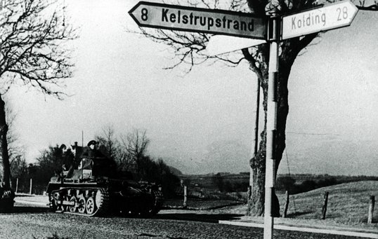 Tyskerne var mere synlige i byerne end på landet. Den 9. april 1940 så man dog soldater og kampvogne dukke op hele vejen gennem landet. Her er det en tysk panserkampvogn, der er på vej mod Kolding. Foto: Getty Images, fra bogen ’Besættelsen i billeder’, af Thomas Harder, Lindhardt og Ringhof