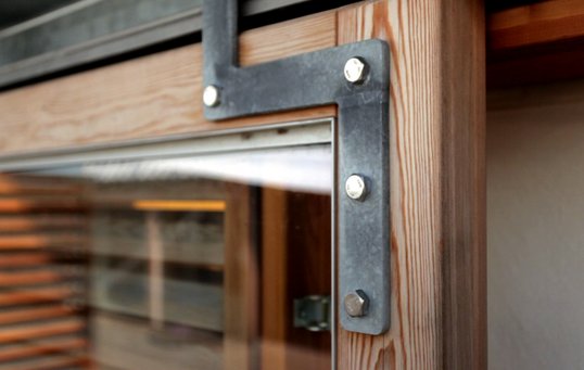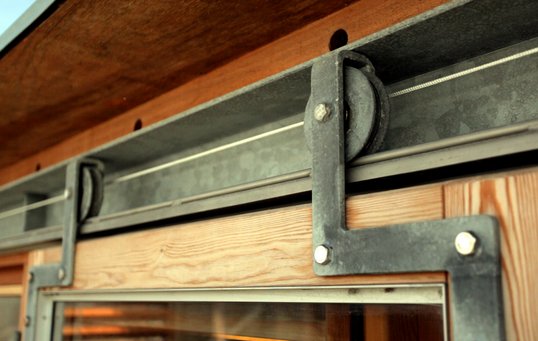 Udvendigt fremstår huset med en industriel råhed med synlige konstruktionsdetaljer i galvaniseret stål: bolte, møtrikker, hjul, skinner og beslag, så du kan se, hvordan huset er skruet sammen.