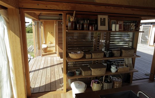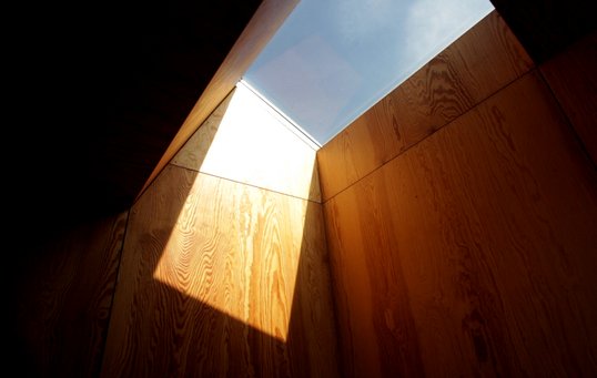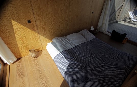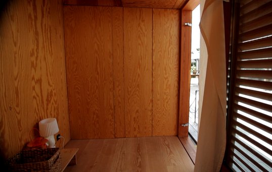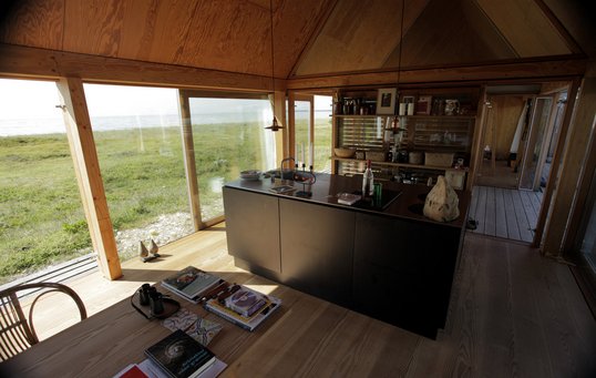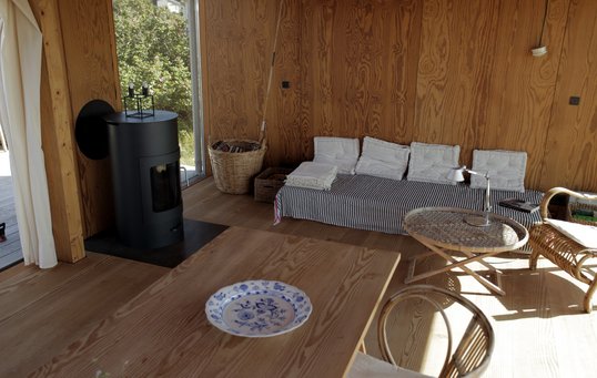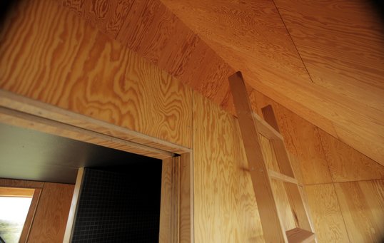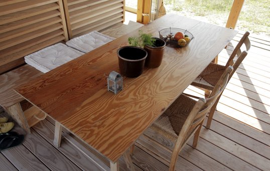 I hendes sommerhus er væggene beklædt med varm og gylden krydsfiner, og hun har brugt pladernes imiterede træstruktur som en slags tapet i rummet. De simple krydsfinérplader dukker også op andre steder i indretningen, bl.a. som bordplader.