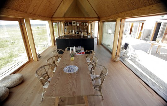 Sommerhuset kan åbnes i mange forskellige retninger, og det centrale gårdrum er fuldkommen integreret med resten af huset, fordi du i kraft af de mange skydedøre netop kan skyde rum til og fra alt efter behov og vejr.