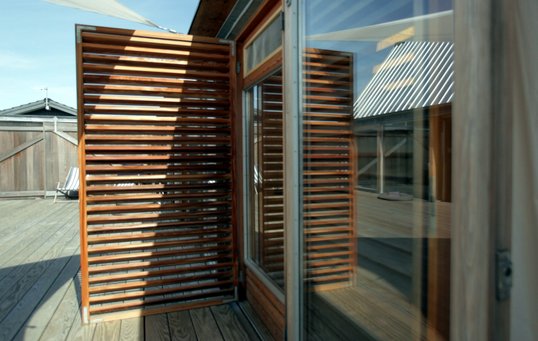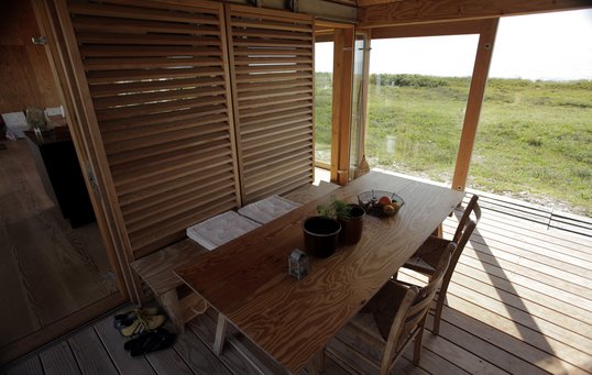 Laden har glasfacader, der kan lukkes op til begge sider. Det betyder, at man kan kigge tværs igennem huset og ud til havet, når man opholder sig i gården.