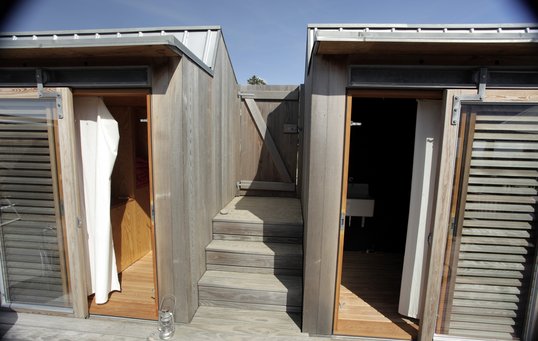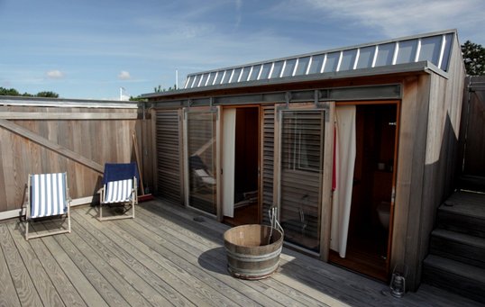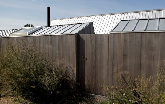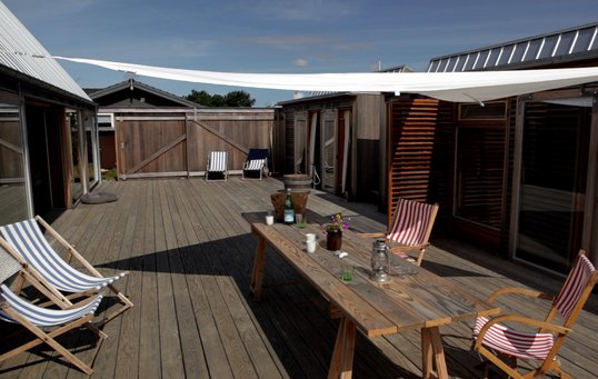 Hovedhuset, som Lene kalder for laden, afgrænser gårdrummet ud mod vandet, og på modsatte side findes gæstefløjen med huleagtige sovekabiner, der danner ryg mod grusvejen. I hver ende af gårdrummet skærmer store skydeporte for kig fra naboerne.