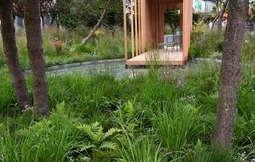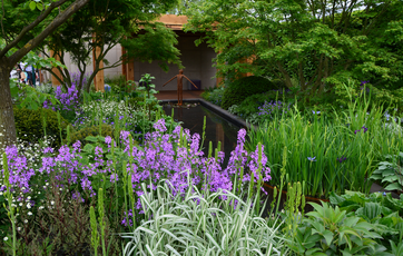 I skoven er der ofte små skovsøer. Her er den steriliseret med et rektangulært bassin omkranset af flerstammede ahorn og pudeklippede takstoppe. Bunden er naturlig og skødesløst beplantet med almindelig aftenstjerne, hosta, astilpe og hvidstribet rørgræs. Som på billedet kan det fint placeres i nærheden af måske endda terrassen, og dermed får du bragt årstiderne helt op til huset.
