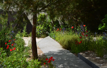 Somme tider kan et enkelt træ gøre hele forskellen som her langs stien. Fyrretræet øger spændingen og oplevelsen af haven og lysten til at bevæge sig ned langs stien. I din have kan det være stien ned gennem haven, som du tilplanter med et enkelt træ eller op langs indgangsbelægningen i forhaven.