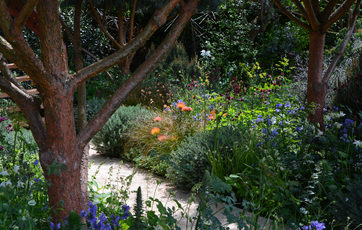 Med flere træer forskellige steder i din have, opnår du fin skygge og solpletter. Samtidig får du en have hvor der er mere oplevelse og dybde. Her er det fyrtræer, der er drysset langs stien, og som giver et fint lys, som kastes ned i staudebedene, imens andre områder ligger mere i skygge og dermed ændrer blomsternes farver.