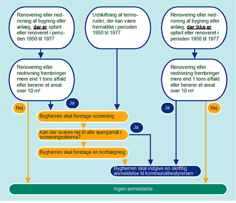 Her kan du se en skematisk fremstilling af fremgangsmåden ved anmeldelse af nedrivning, renovering og nybygning efter affaldsbekendtgørelsens regler.
