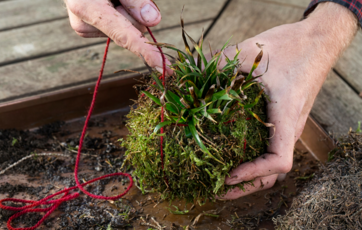 Tag planten du vil anvende og fjern så meget af jorden som muligt. Når du laver mosbolde til udendørs brug, skal du huske at benytte hårdføre udendørsplanter, som fx bregne, husløg, miniaturefyr eller gran. Hvis den skal hænge i dit vindue, kan du også bruge mere sarte stueplanter som orkidé, hyacint og julestjerne.