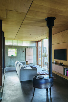 Det lille køkken er i åben forbindelse med stuen, hvor stemningen er varm og rolig. Gulvet er af beton, og ud over væggen af polycarbonat, som er et stærkt, men fleksibelt plastmateriale, er alle andre flader beklædt med krydsfinér. Det giver rummet en varm glød og en behagelig akustik.
