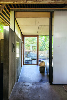 Væggen af polycarbonat adskiller tegnestuen fra den private del af laden, og for at passere fra tegnestue til privat bolig skal man desuden træde op på et bredt, asymmetrisk trin af beton. Overgangen fra tegnestue til privat stue bliver yderligere markeret af, at man her går fra loft til kip til et loft i almindelig stuehøjde.