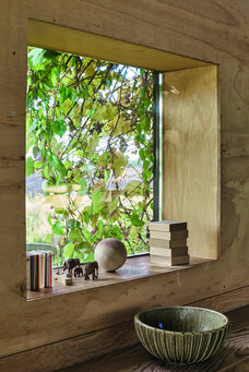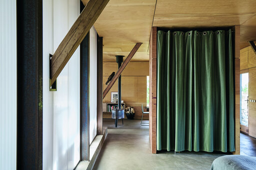Valget af krydsfinér til vægge og lofter kom fra et overraskende sted: fra hønsehuset. Imens parret byggede på den gamle lade, boede de nemlig i grundens gamle hønsehus, som de inden da havde renoveret, isoleret og forvandlet til et simpelt og hyggeligt gæstehus med dobbeltseng, et par reoler og en lille brændeovn. Hele rummet blev pakket ind i krydsfinér af okoumétræ, så det var krydsfinér, det hele begyndte med, fortæller Peter: