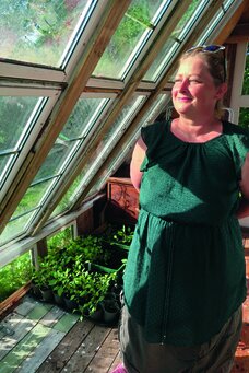 Hun smiler og griner meget, selvom livet tydeligvis har givet hende nogle knubs undervejs. Og en stor del af årsagen lader til at være i, at hun bor, som hun gør – og ikke mindst i hendes kærlighed til det grønne.