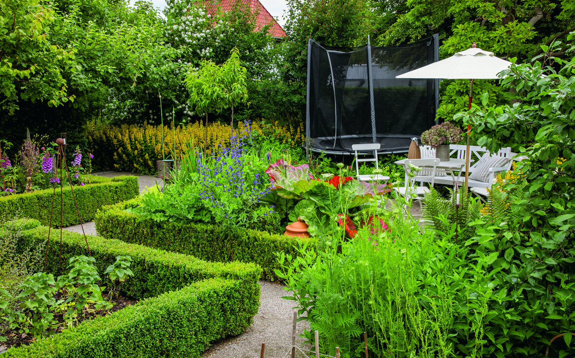 – Mentalt accepterer jeg mange ting, og jeg går også meget op i, at haven skal kunne bruges, siger Nanette Bang, der trods en stor hang til æstetik har skabt plads til både boldspil, havetrampolin og badebassin.