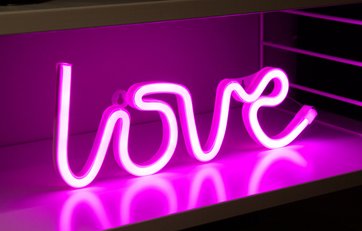 Klassiske neonskilte kan skabe en lækker retro-stil, men er generelt nogle slemme energislugere. Heldigvis kan man i dag få LED-lamper, der ligner, som skiltet ”Love,” der spreder et romantisk rosa skær. Det kan for eksempel hænges på væggen eller stå på et skrivebord, en hylde eller i vindueskarmen. Måler 35 x 13 x 2 cm og kan enten kobles til en USB-kontakt eller forsynes med 3 AA-batterier. Pris: 149 kroner