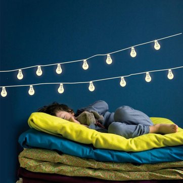 Du kan også klistre hyggen på væggen, som her med en selvlysende frise, der kan anvendes på alle glatte overflader. Wallstickeren (vægklistermærket) måler 230 cm og har 21 motiver af glødepærer. Vil nok især gøre lykke på børneværelset. Pris: 249,95 kroner.