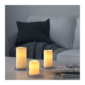 Kunstige LED-stearinlys er en oplagt og populær erstatning for den ægte vare. De udmærker sig dels ved at være betydeligt billigere i drift end almindelige stearinlys, og dels udgør de ikke en brandfare. De kunstige lys fås både som blok-, stage- og fyrfadslys. Her er det en bloklys-model fra IKEA, som kan bruges både inde og ude. Den er batteridreven og flakker ovenikøbet som et rigtigt stearinlys. En indbygget timer kan tænde lyset automatisk på samme tid hver dag og lade det være tændt i 6 timer. Pris for et sæt af tre GODAFTON bloklys: 79 kroner.