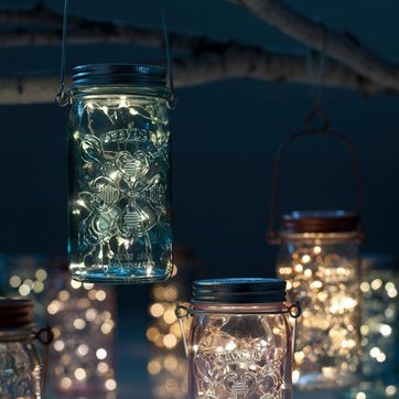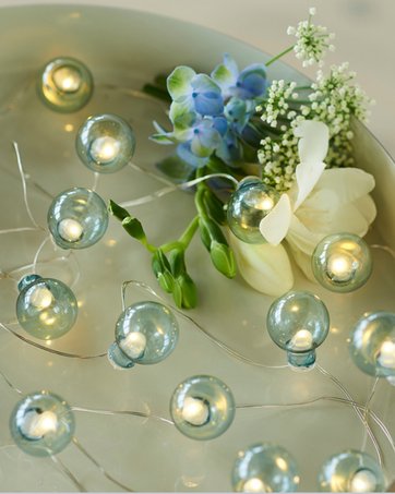 Lyskæder hører ikke kun julen til, men kan bruges året rundt. De batteridrevne modeller kan se elegante ud i gennemsigtige beholdere, såsom vaser, tomme flasker, lanterner, glaskupler eller som her i en lyseblå glaskrukke med låg, der kan pynte både udendørs for eksempel på terrassen eller hængende i et træ eller indendørs som borddækning eller i vindueskarmen. Bruger 2 AAA batterier. Pris: 169 kroner