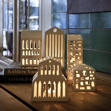 Hvis du ikke er begejstret for tanken om kunstige stearinlys, kan du eventuelt gemme dem lidt væk i en fyrfadsskjuler, som for eksempel Kählers Urbania lyshuse. På den måde får du hyggeligt lys, men slipper for at se på selve lyskilden. Husene fås i seks forskellige varianter: byhuset, højhuset, kirken, Pantheon, basilika og lyshus. Pris: 199-249 pr. stk.
