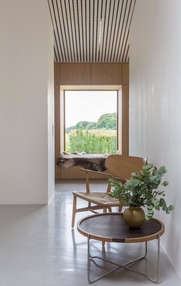 Arkitekt Allan Lorenzen har skabt wellness i boligen, der ligger i perfekt harmoni med omkringliggende natur. Den lange skabsvæg i badeværelset har en dyb vinduesniche, der fungerer som siddeplads og giver et indrammet kig til naturen – næsten som et maleri. Foto: Andreas Mikkel Hansen