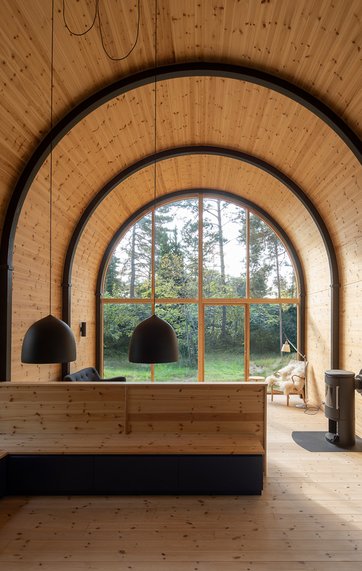 Sommerhuset, der ligger tæt på Kattegat og er tegnet af arkitekt Eva Kristine Brørup, har form som en tube. Kombinationen af træ, tubeformen og endevæggen af glas skaber et helt særligt arkitektonisk rum, hvor blikket drages mod naturen for enden af stuen. Foto: Danske BoligArkitekter