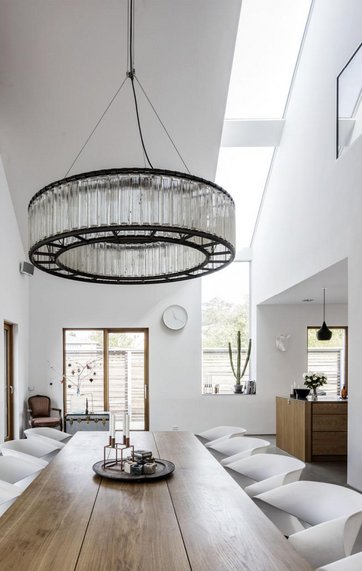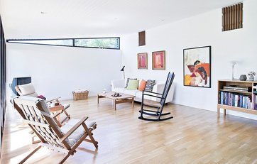 Arkitekt Uffe Topsøe-Jensen har ladet sig inspirere af nordisk og japansk arkitektur i nyfortolkning af det traditionelle saddeltagshus. En sprække af lys lukkes ind ad loftvinduet, der bevæger sig ned på siden af huset og bliver til ét aflangt vindue. Lyset og det dobbelthøje rum skaber en spændende rumlighed i boligen. Foto: Danske BoligArkitekter