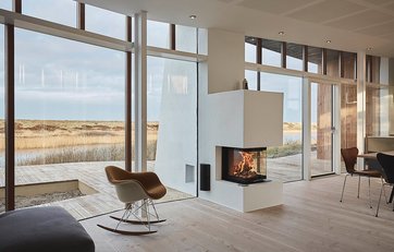 Ruderne i det ombyggede sommerhus har arkitekt Søren Sarup ladet gå helt ned i gulvet i stedet for at ramme dem ind med normale vinduesrammer. Terrassen og gulvet ligger i samme niveau, så ude og inde flyder sammen, som var det ét. Pejsen i midten står som en skulptur i glasfacaden. Foto: Andreas Mikkel Hansen