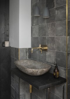 - Her er der ikke sparet: Messingarmaturer og wc-skyl. Parret valgte at indkøbe det hele fra samme firma, så begge badeværelser var ens, bl.a. knager, apparatur, bruser og skylplader til wc.