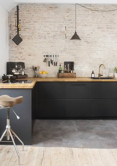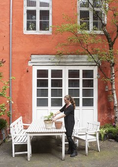 I lejligheden lå engang det snedkeri, som udskar de kendte, røde dukkevogne. I dag er her indrettet et imponerende køkken-alrum. Stine Stroyer har selv banket den rå murstensvæg ren for gammel maling og puds og derefter kradset alle fuger ud og fuget op igen.