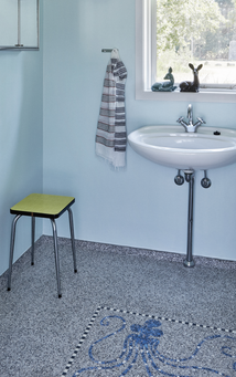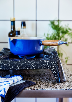 Bakelitknopperne til skufferne blev fundet på en tysk hjemmeside, og vandet, der løb i hanen, forblev koldt. Der blev tegnet et gasbord, som passede i højden, og terrazzopladen blev produceret af en håndværker, der havde lavet den slags siden 50’erne, og som nøjagtig kopi af de plader, der var på det gamle gasbord.
