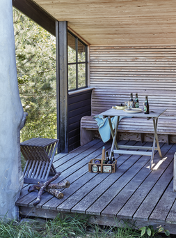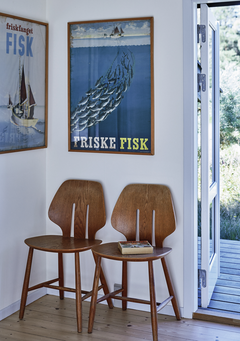 Huset fra 1958 står med de originale brædder og med udsigt mod Isefjorden. Træmøblerne er fra Skagerak.