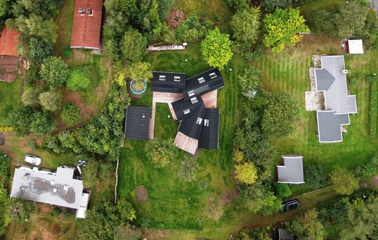 Fra oven har huset form som en vifte med fem fingre. De mange skrå flader har givet plads til 8 tagvinduer, fordelt i næsten alle rum, og ikke ét af dem er placeret tilfældigt. De fanger alle solen på - men på forskellige tidspunkter af dagen.