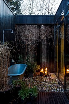 Selv på badeværelset er der vinduer fra gulv til loft, og føles naturen ikke tæt nok på, er der skam udebadekar med indlagt varmt vand, hvilket får familien til at bruge det hele året.