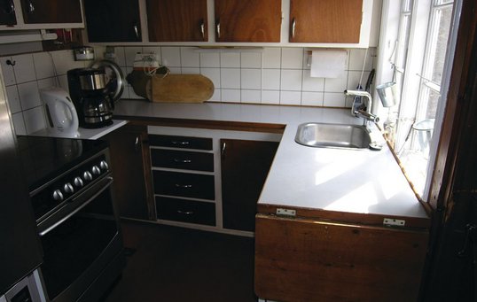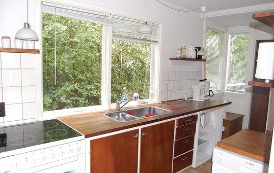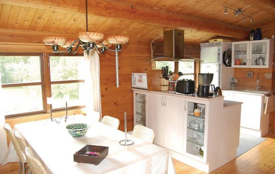 1980’erne var også årtiet, hvor køkken-alrummet for alvor blev udbredt i de danske boliger - også i sommerhuset. Man ville gerne udnytte pladsen på en ny måde, skabe åbenhed og fællesskab på tværs af funktionerne i sommerhuset. Råt træ og hvid maling var indbegrebet af sommerhusfarver. Foto: NOVASOL