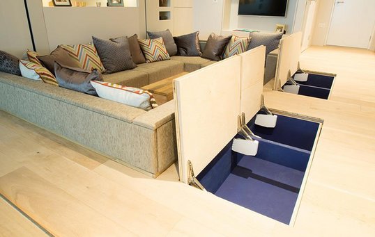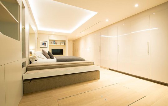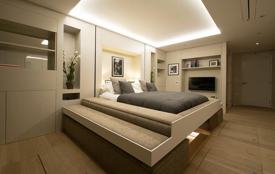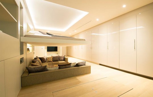 Lejlighedens midtpunkt er en stor nedsænket sofagruppe. Oppe under loftet over den hesteskoformede sofa hænger lejlighedens dobbeltseng. Sengen hæves og sænkes ved hjælp af kontravægt, men er også udstyret med en lille motor, der betyder, at et tryk på en knap er alt, hvad der kræves for at sænke den. I tilfælde af strømsvigt er det let at trække sengen ned manuelt, så den er ikke kun virkelig tjekket, den er også meget sikker.