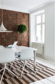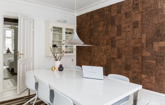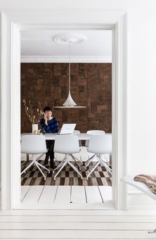 Med en bolig midt i den summende storby var det vigtigt for Helle at lukke naturen ind i stuerne mest mulig. Det har hun blandt andet gjort ved at tapetsere en stor væg med kork og indrette med tilbehør i pels og træ.