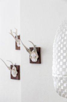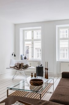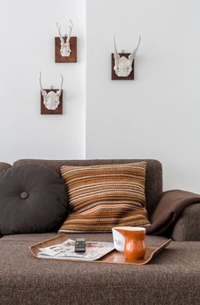 - Jeg ville gerne skabe en fornemmelse af at sidde ved en rolig skovsø. Sofaens brune farve minder om jorden, vi står og går på, og glasbordets blanke overflade reflekterer træstammerne ligesom vandoverfladen på en sø ville gøre det, fortæller Helle, der har valgt farven brun, som det gennemgående tema i indretningen. Sammen med de hvidmalede rum tilfører den brune farve en harmonisk elegance, der emmer af meditativ ro.