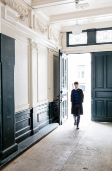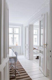 Det er en høj stue, så folk på gaden kan ikke kigge direkte ind. Men jeg var nødt til at male alle gulve hvide for at få mere lys ind. Det gjorde helt klart en stor forskel og betyder, at lejligheden slet ikke opleves som en stuelejlighed. Samtidig har det haft den effekt, at alle rummene flyder bedre sammen og ikke opleves som små, opdelte rum, men i stedet som én stor sammenhæng.